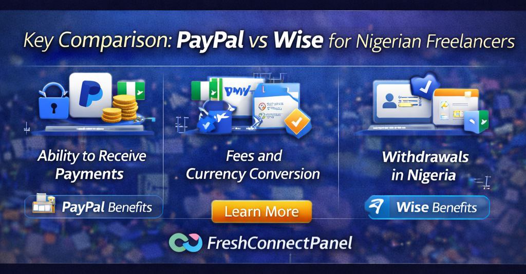 This guide provides a clear, honest comparison of PayPal vs Wise for freelancers in Nigeria, including fees, receiving ability, withdrawals, and real-world usability—while also explaining how FreshConnectPanel helps users set up and manage both platforms correctly.