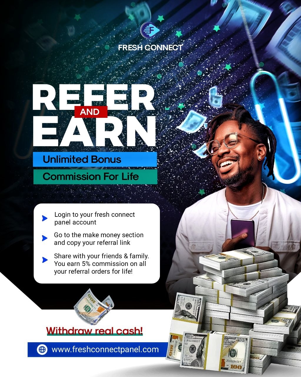 With the FreshConnectPanel Refer and Earn Program, you can turn referrals into real income without selling products, creating content, or investing capital.